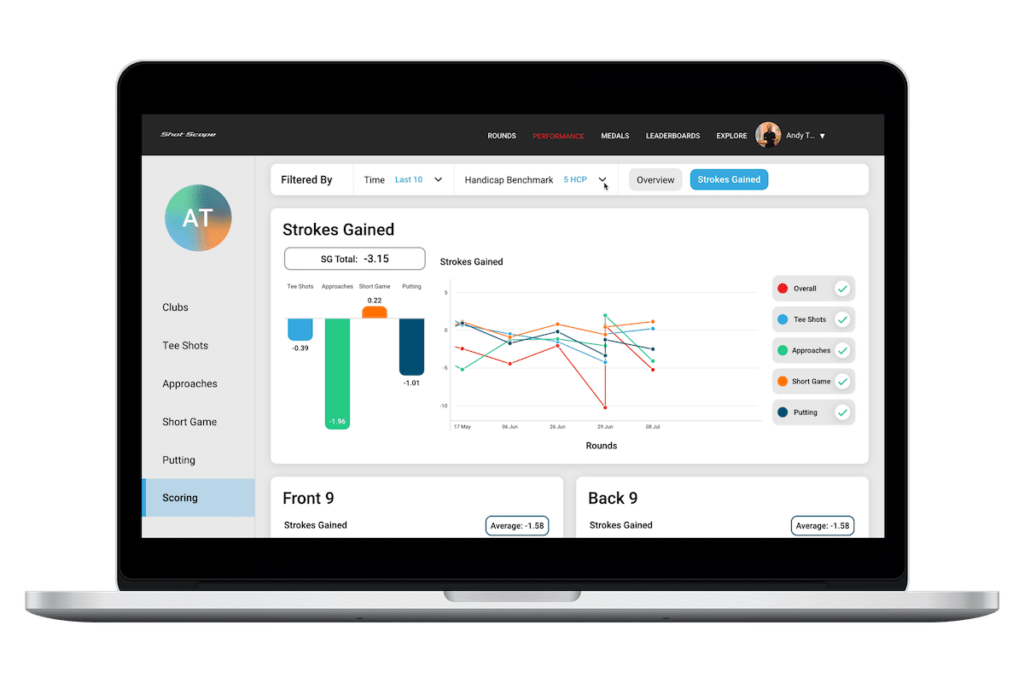 As well as general performance statistics like these, Shot Scope also provides detailed strokes gained information for tee shots, approach shots, short game and putting for individual or collective rounds. These can also be compared against players of varying handicap groups, so you can see exactly which area of your golf game is costing you strokes.